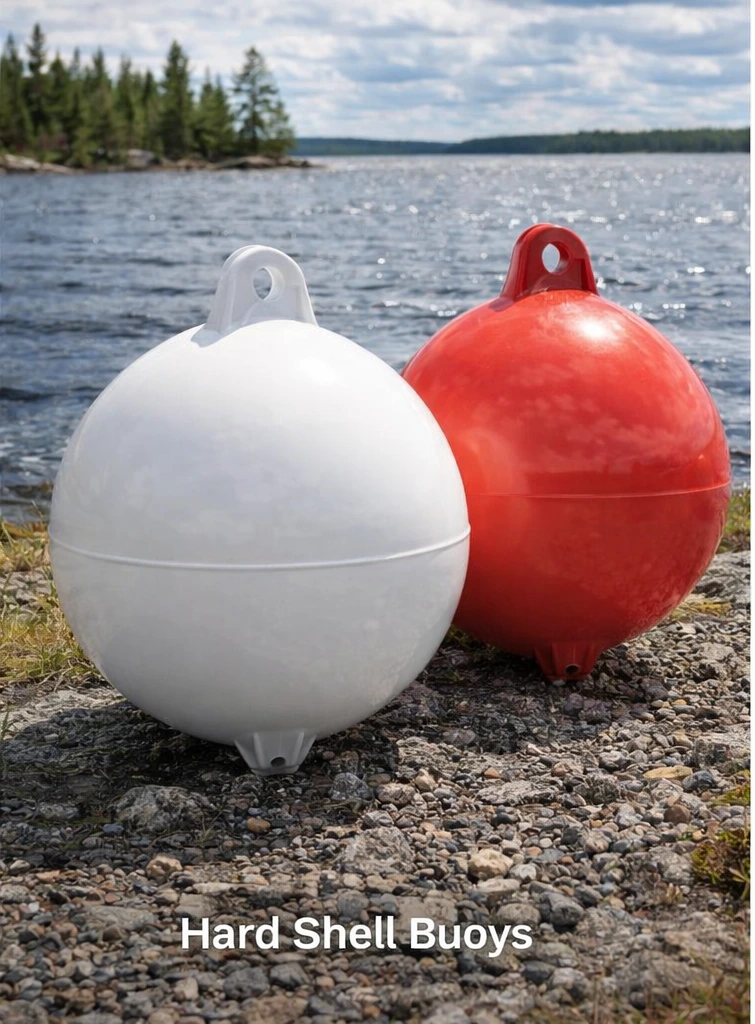 • Hard Shell Buoys: Constructed from tough, UV-stabilized plastic. These are built to withstand our harsh Canadian climate and are resistant to cracking and fading.