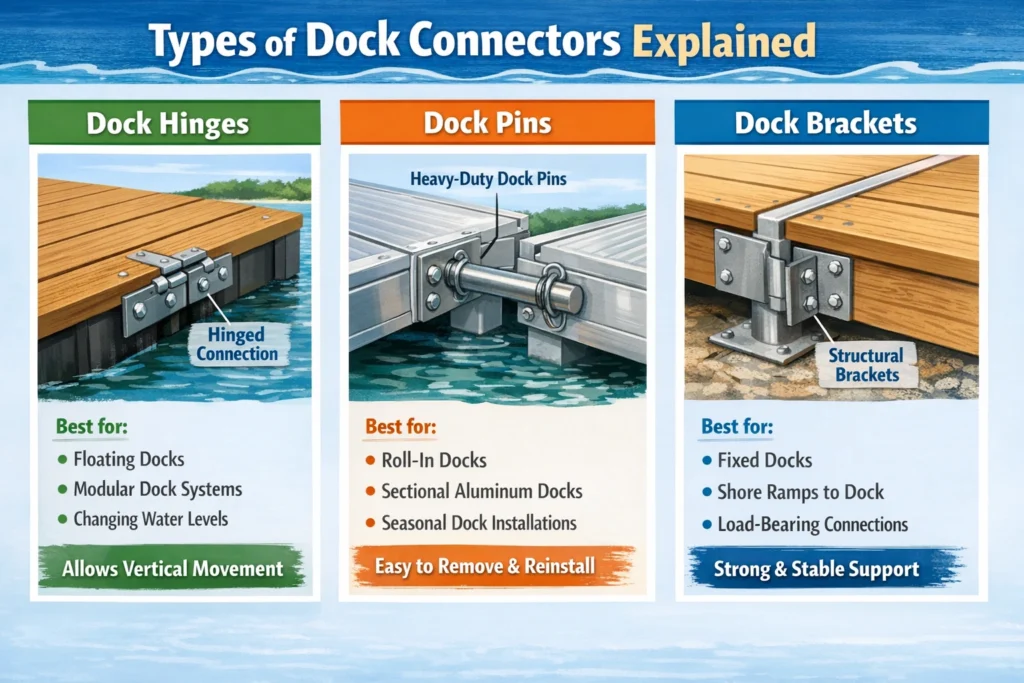 Dock connectors are the hardware components that join dock sections together. They allow individual dock pieces to function as a unified system while still accommodating movement from waves, water level changes, and seasonal conditions.